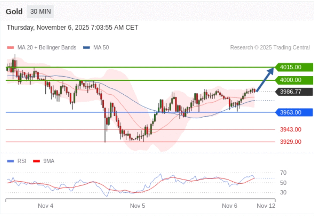 Harga (saat ini di 3986.77) konsisten bergerak dalam tren naik sejak kemarin (5 November) dan diperdagangkan dengan nyaman di atas Moving Average (MA) 50 (garis biru solid).