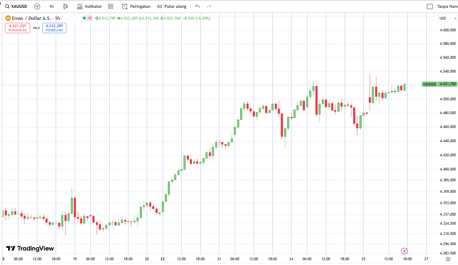 Harga emas hari ini saat ini diperdagangkan di level psikologis $4.519 per troy ounce, sebuah rekor tertinggi baru (All Time High) yang didorong oleh kombinasi faktor makroekonomi yang sangat kuat di penghujung tahun 2025 ini.