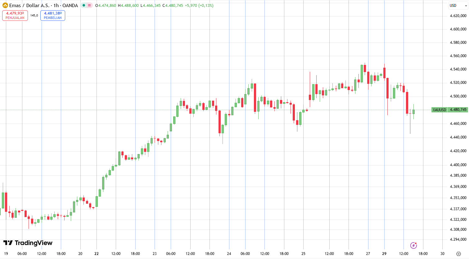 Tren Saat Ini: Koreksi (Pullback). Setelah mencapai puncak di area 4.540, harga emas mengalami tekanan jual yang signifikan dan kini diperdagangkan di sekitar level 4.480. Candle merah panjang terakhir menunjukkan momentum bearish jangka pendek yang kuat akibat data ekonomi AS yang positif.