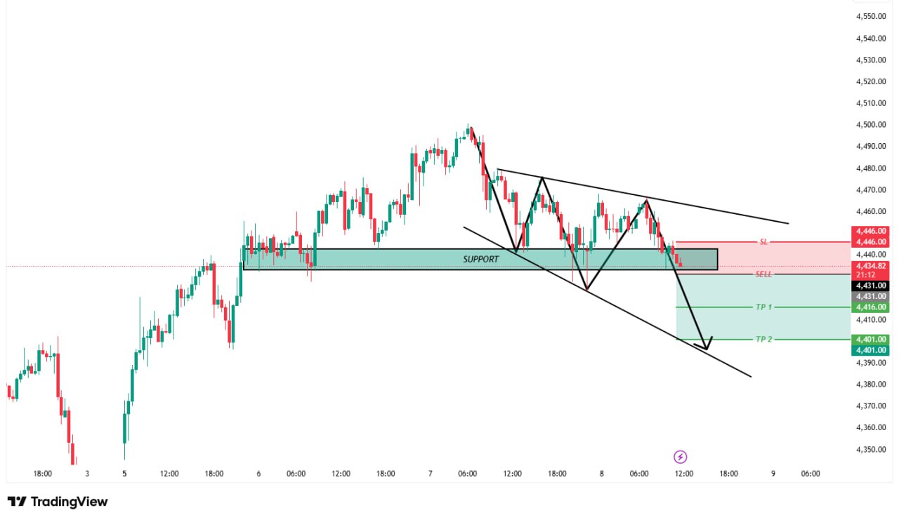 Pada timeframe M30, XAUUSD sedang membuat market struktur bearish dalam jangka pendek dan saat ini berpotensi untuk membuat chart pattern Descending Broadening Wedge apabila harga mampu melakukan breakout pada level support 4440-4435 dengan momentum kuat maka XAUUSD bisa melanjutkan penurunannya sehingga terdapat peluang untuk melakukan SELL dengan risk to reward 1:2.