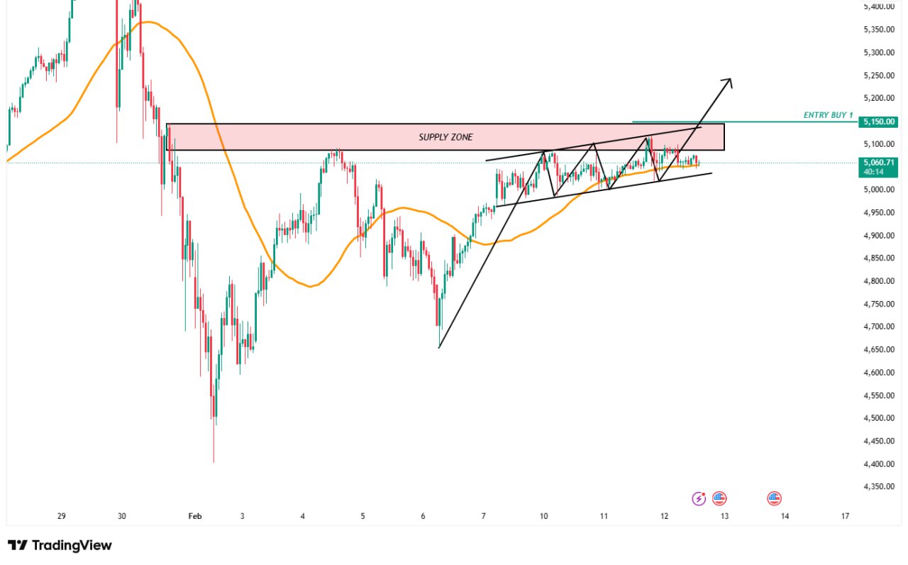 Hambatan Supply Zone: Terdapat area Supply yang cukup tebal pada rentang 5.080 – 5.140. Saat ini harga sedang melakukan konsolidasi di bawah area ini, membentuk pola sideways kecil di dalam channel sebagai persiapan untuk upaya breakout.