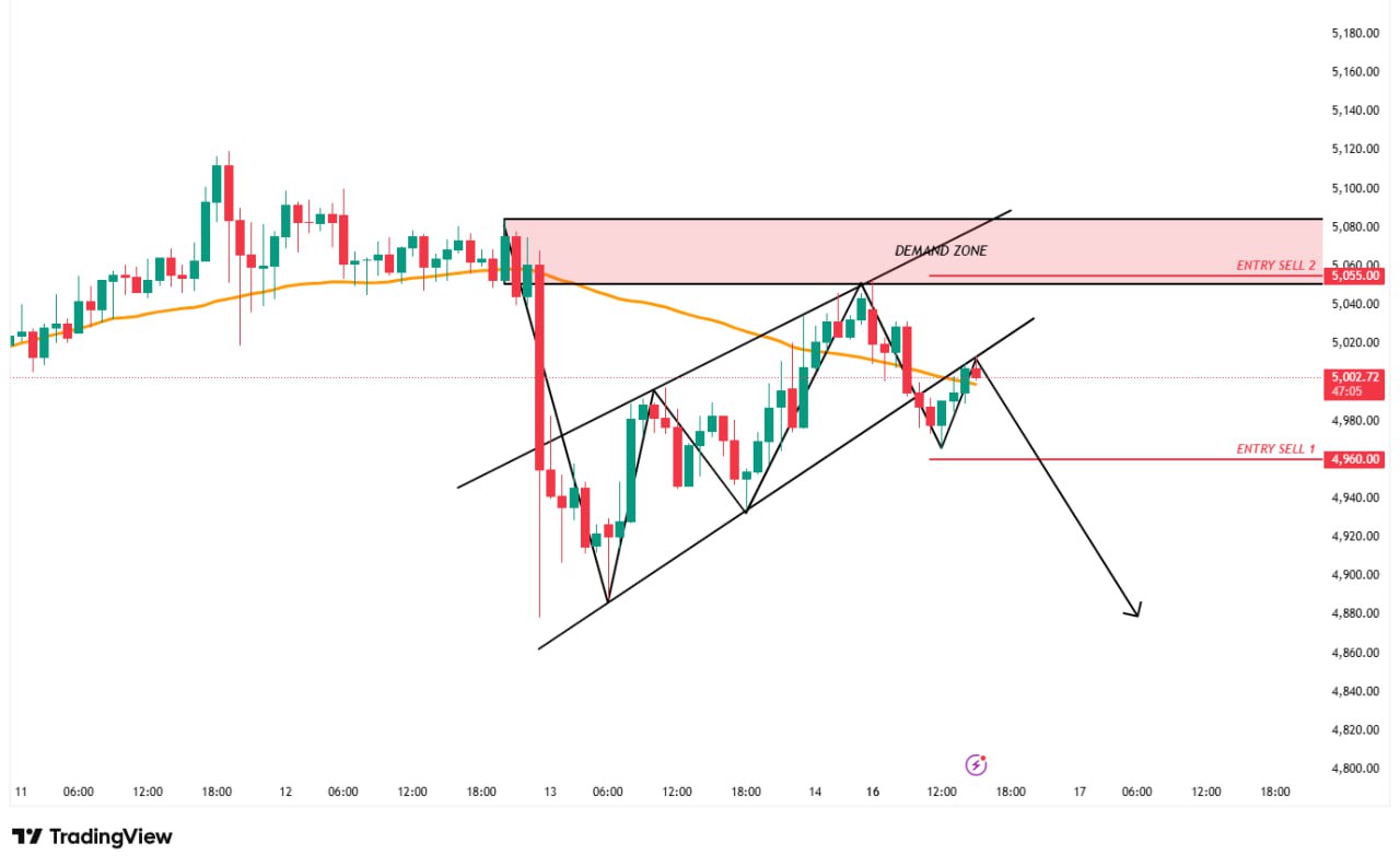 Kondisi Saat Ini: Harga sedang dalam fase pullback atau melakukan retest di sekitar level $5,002.72. Terdapat area resistansi kuat (Demand Zone yang kini menjadi Supply) di kisaran 5,055.00 – 5,080.00.