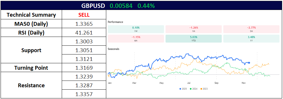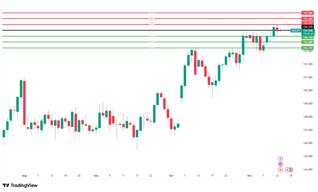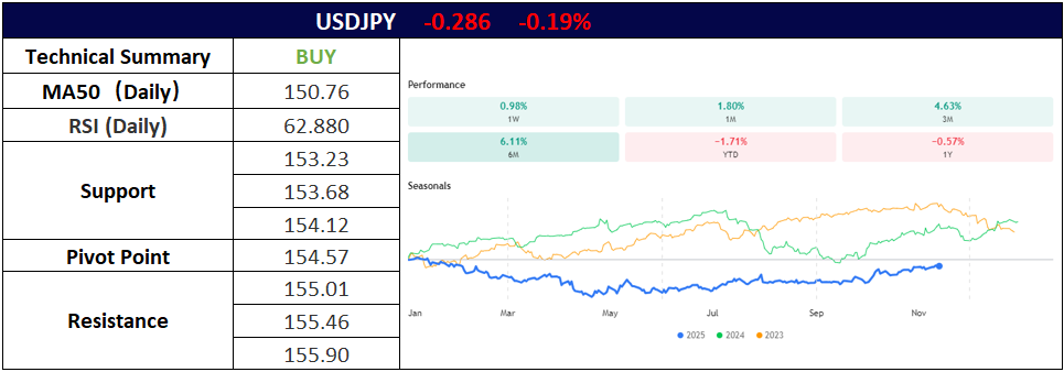 Pasangan USD/JPY turun ke 154.50 di sesi Asia Jumat, karena Dolar AS melemah terhadap Yen Jepang. Pelemahan Dolar ini didorong oleh keraguan pasar yang semakin terbagi mengenai pemangkasan suku bunga The Fed pada bulan Desember, dengan probabilitas rate cut kini turun di bawah 51% (dari 62,9% sehari sebelumnya). Di sisi Jepang, Yen tetap tertekan oleh kekhawatiran bahwa PM Takaichi akan mendorong BOJ untuk menunda kenaikan suku bunga (sikap dovish).