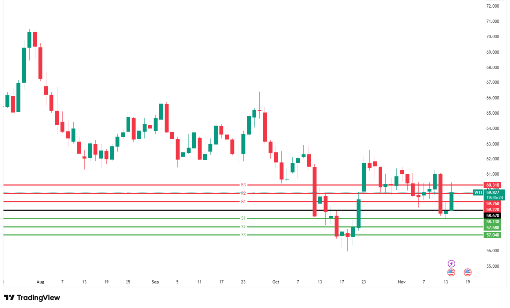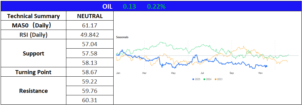 Harga minyak dunia bergerak stabil di $58.59 pada Kamis, setelah anjlok 4% pada hari sebelumnya akibat laporan OPEC yang menunjukkan prospek oversupply. Berakhirnya shutdown pemerintah AS menjadi faktor positif, karena operasional pemerintah yang kembali normal diharapkan dapat mendukung pemulihan permintaan bahan bakar. Meski begitu, kenaikan harga minyak sangat terbatas oleh kekhawatiran pasokan global yang melimpah dan dampak sanksi AS terhadap minyak Rusia.