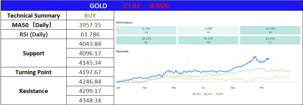 Harga emas diperdagangkan positif di sesi Asia Jumat, pulih dari penutupan $4.171. Berakhirnya shutdown pemerintah AS membuat pelaku pasar kini fokus menanti rilis data ekonomi yang tertunda. Trader berspekulasi data tersebut akan menunjukkan pelemahan pasar tenaga kerja yang dapat menekan Dolar AS dan mendukung emas. Namun, penguatan emas dibatasi oleh tumbuhnya keraguan akan pemangkasan suku bunga The Fed, dengan probabilitas rate cut Desember turun di bawah 51% setelah komentar hawkish pejabat Fed.