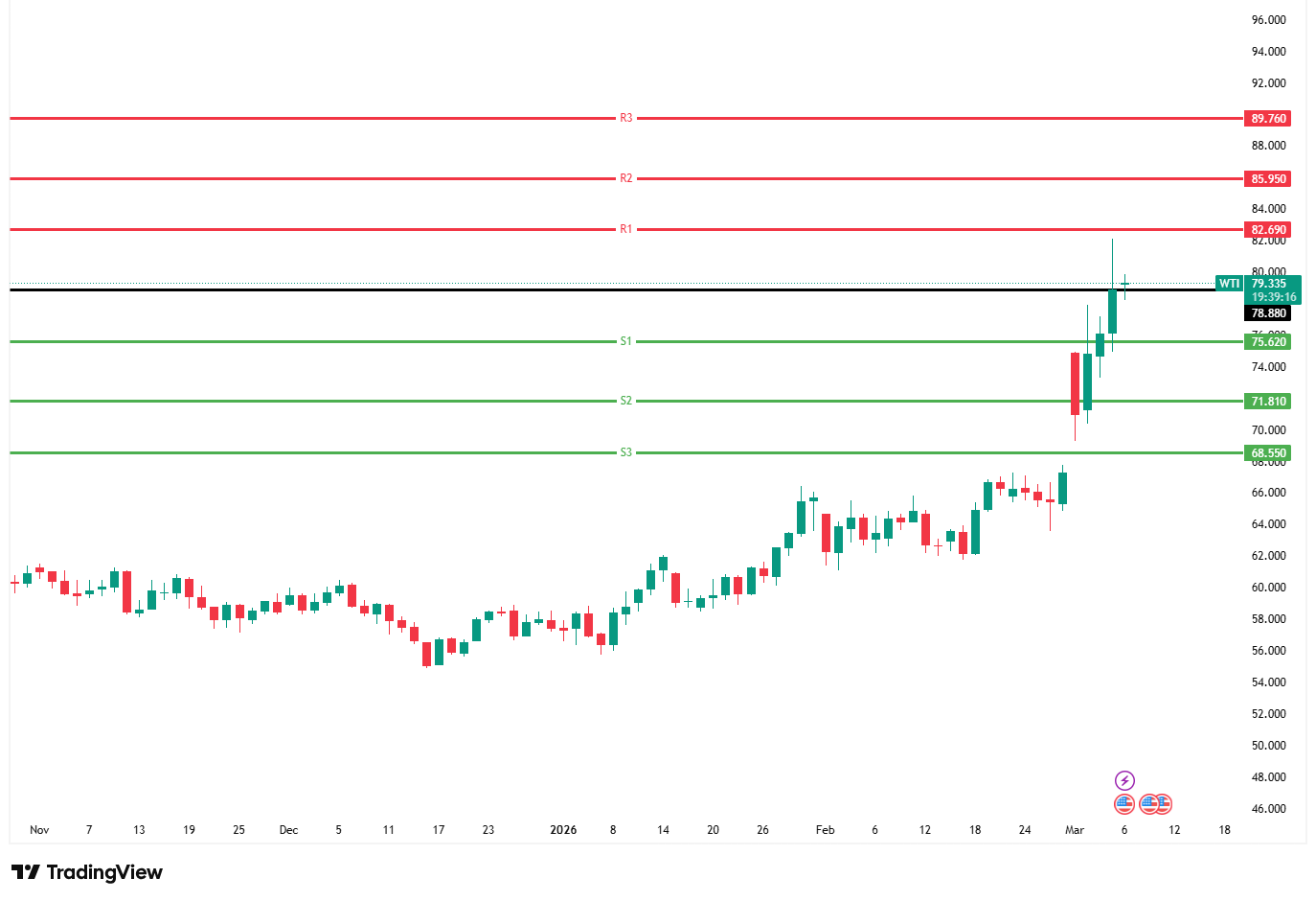 Harga minyak mentah WTI melonjak melewati level $78,10 setelah mencatatkan kenaikan harian sebesar 8,5%, yang merupakan kenaikan terbesar sejak tahun 2020. Kenaikan tajam ini dipicu oleh eskalasi perang antara Amerika Serikat dan Iran yang mengakibatkan terhentinya lalu lintas pengiriman di Selat Hormuz, jalur vital bagi seperlima pasokan minyak dunia. Serangan terhadap kapal tangker terus berlanjut di wilayah Teluk, termasuk laporan adanya kerusakan pada tangker berbendera Bahama akibat ledakan di dekat pelabuhan Irak. Namun, potensi kenaikan harga sedikit tertahan oleh laporan EIA yang menunjukkan cadangan minyak mentah AS naik sebesar 3,475 juta barel, melebihi prediksi pasar.