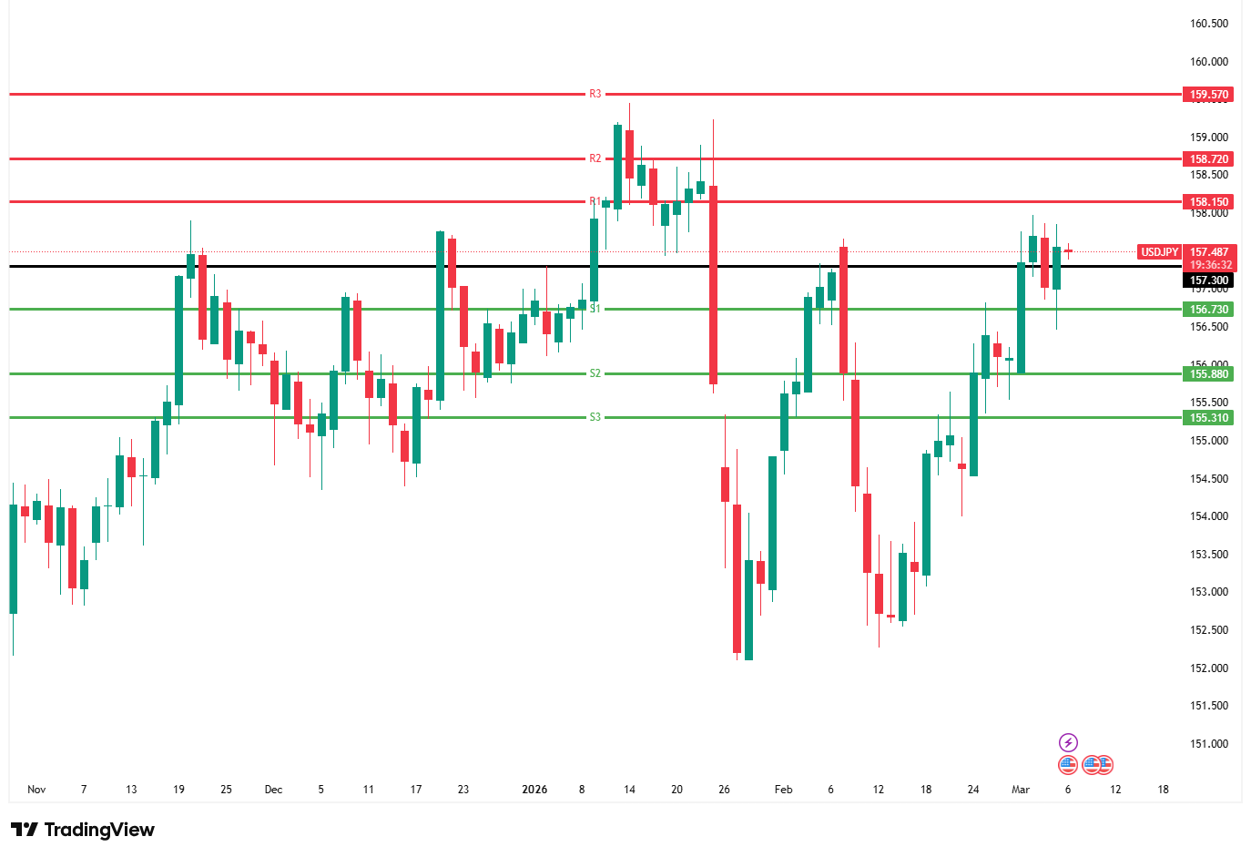 Pasangan USD/JPY diperdagangkan di kisaran 157,40 karena Yen menghadapi tekanan dari tantangan ekonomi domestik Jepang yang lesu dan inflasi tinggi akibat risiko eksternal. Gubernur BoJ Kazuo Ueda memperingatkan bahwa konflik Timur Tengah dapat berdampak material pada ekonomi, yang mensinyalkan bank sentral mungkin menahan suku bunga dalam periode yang lebih lama. Di sisi lain, Dollar AS terus menguat seiring pejabat Fed yang masih mempertimbangkan kenaikan suku bunga jika inflasi tetap berada di atas target. Para pelaku pasar saat ini sedang mengamati rilis laporan Nonfarm Payrolls (NFP) untuk melihat potensi pembalikan arah nilai tukar Yen.
