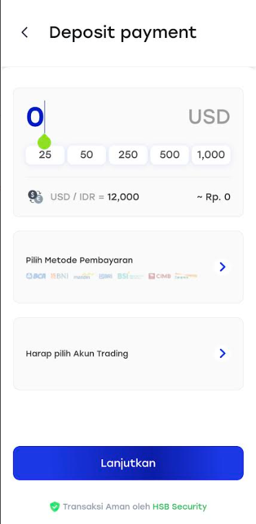- Kurs Tetap: HSB menggunakan kurs tetap $1 USD = Rp 12.000 untuk deposit, memberikan kepastian nilai tukar.