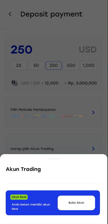 Selanjutnya, tekan kolom “Harap pilih Akun Trading”. Sebuah pop-up akan muncul. Pastikan kamu memilih “Akun Real” sebagai tujuan depositmu. Jika kamu belum memiliki Akun Real, akan ada tombol “Buka Akun” yang bisa kamu tekan untuk membuatnya terlebih dahulu.