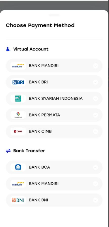 - Virtual Account: Metode pembayaran otomatis yang praktis. Tersedia untuk Bank Mandiri, BRI, BSI, Permata, dan CIMB.