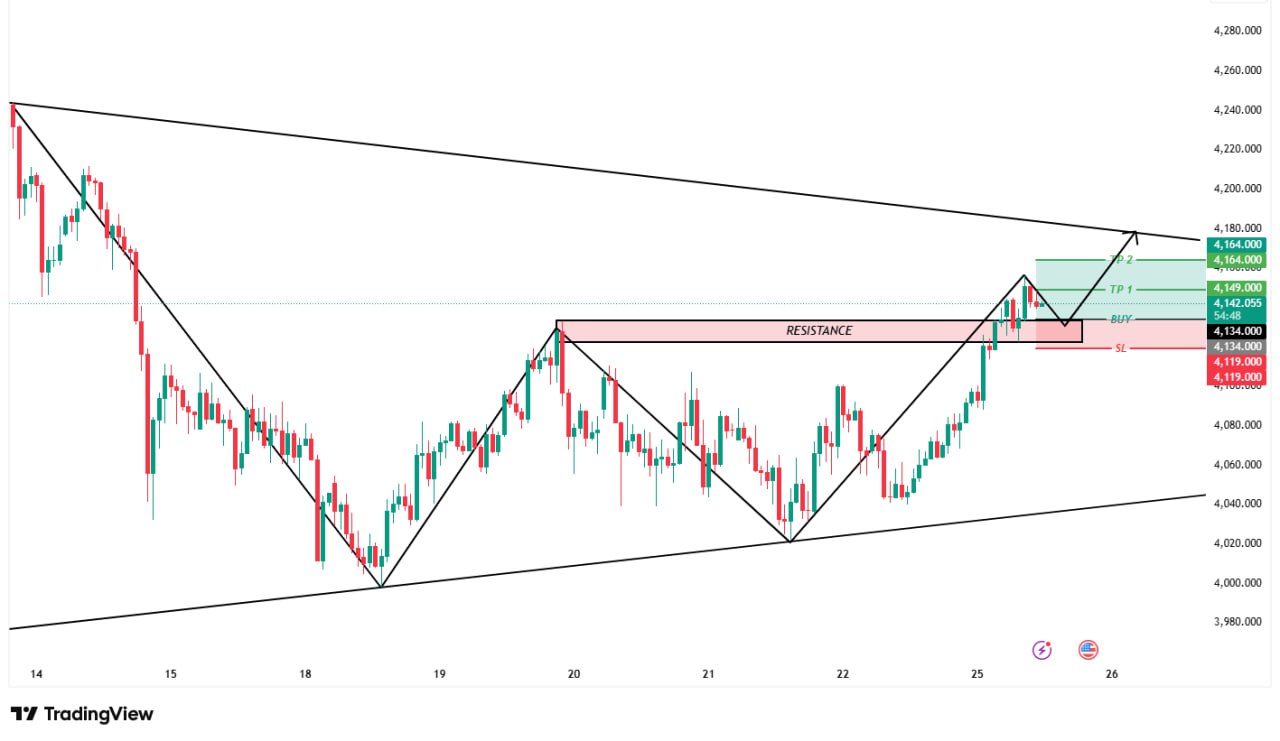 Harga emas kembali mendapatkan momentum bullish seiring melemahnya Dolar AS ke level terendah mingguan dan melonjaknya probabilitas pemangkasan suku bunga The Fed hingga 85% untuk pertemuan Desember. Sentimen ini didorong oleh kombinasi data ekonomi AS yang mengecewakan seperti penjualan ritel yang meleset dari ekspektasi dan anjloknya kepercayaan konsumen serta komentar dovish dari para pejabat The Fed yang secara terbuka mengkhawatirkan pelemahan pasar tenaga kerja dan menyerukan pelonggaran kebijakan.