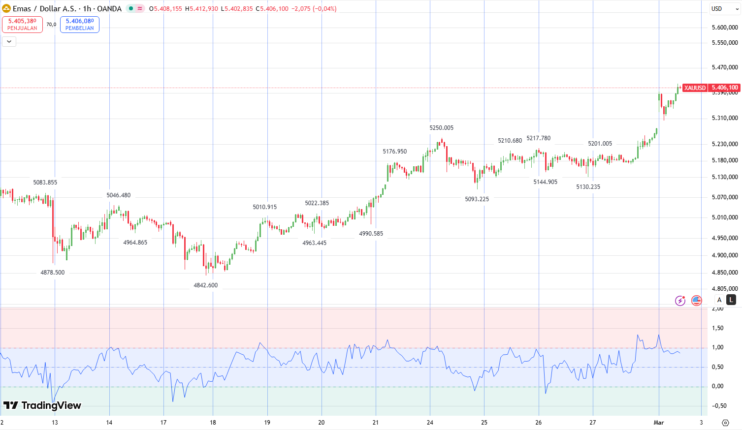 Secara teknikal, emas telah berhasil menembus hambatan horizontal penting di level $5.200 dan menunjukkan momentum bullish yang sangat kuat di awal pekan ini. Indikator MACD berada di wilayah positif dengan histogram yang terus melebar, menandakan bahwa pembeli masih mendominasi pasar setelah kenaikan terbaru. Meskipun indikator RSI berada di angka 68,88 yang mendekati area jenuh beli (overbought), tekanan naik masih terlihat cukup stabil dan belum menunjukkan tanda-tanda kelelahan yang ekstrem.
