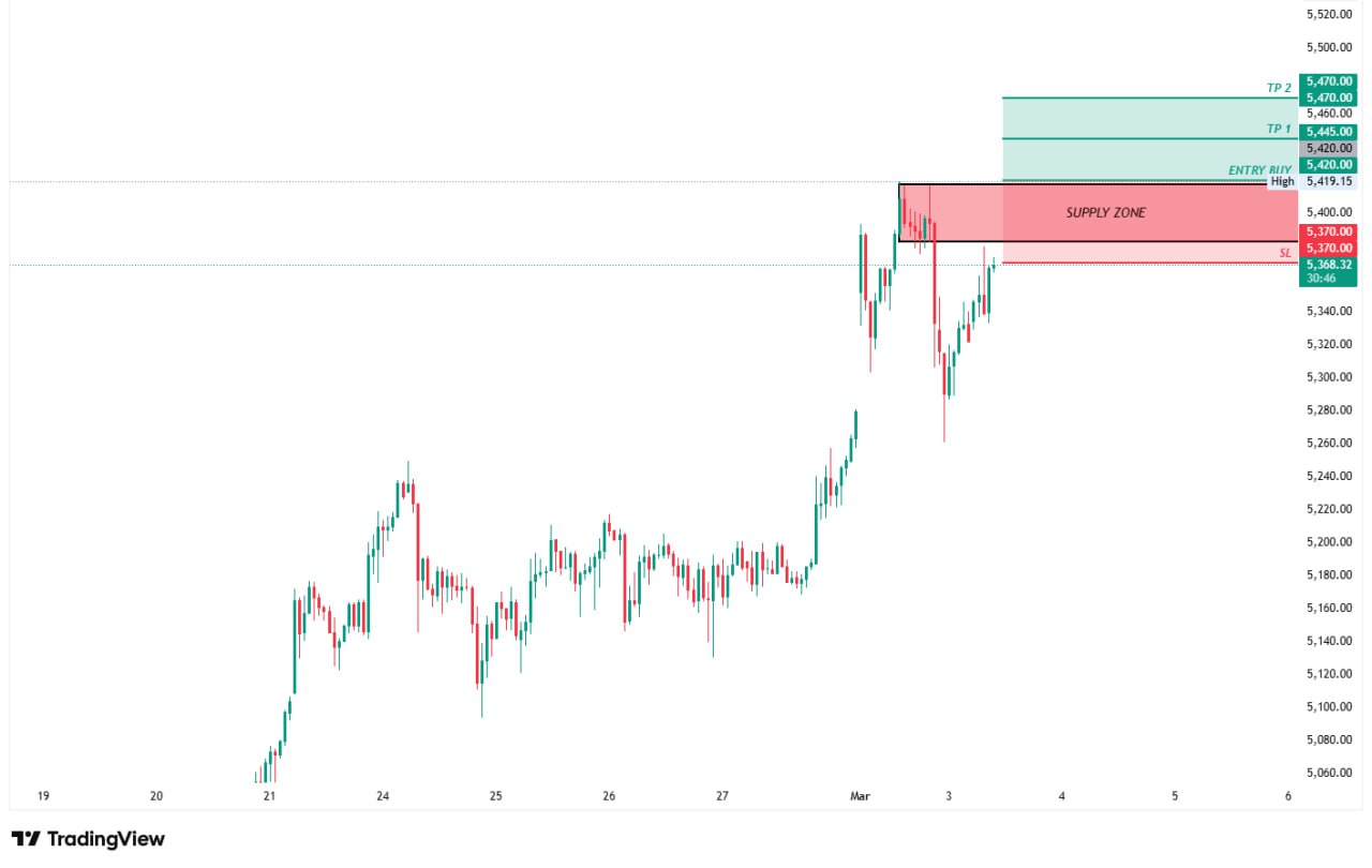 Fokus utama saat ini berada pada zona suplai (supply zone) di rentang harga 5382 hingga 5419. Jika harga berhasil menembus dan bertahan di atas zona tersebut, potensi penguatan lanjutan sangat terbuka lebar dengan rencana eksekusi Buy Stop di level 5420. Target keuntungan ditetapkan pada level 5445 (TP 1) dan 5470 (TP 2), dengan manajemen risiko berupa Stop Loss di level 5370 untuk menjaga rasio risk to reward tetap seimbang di 1:1.