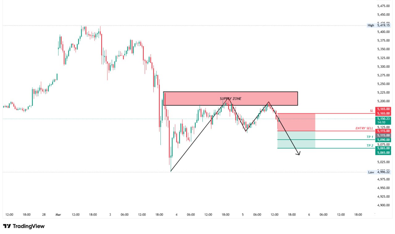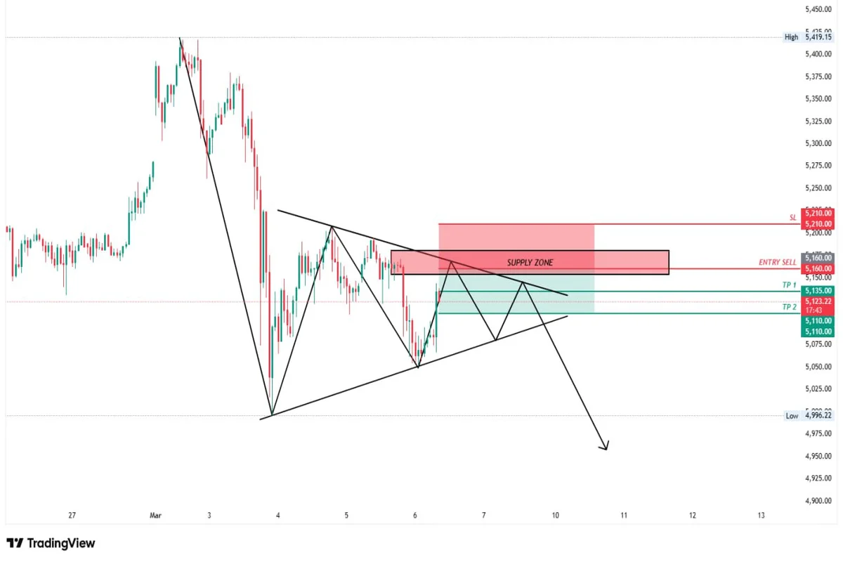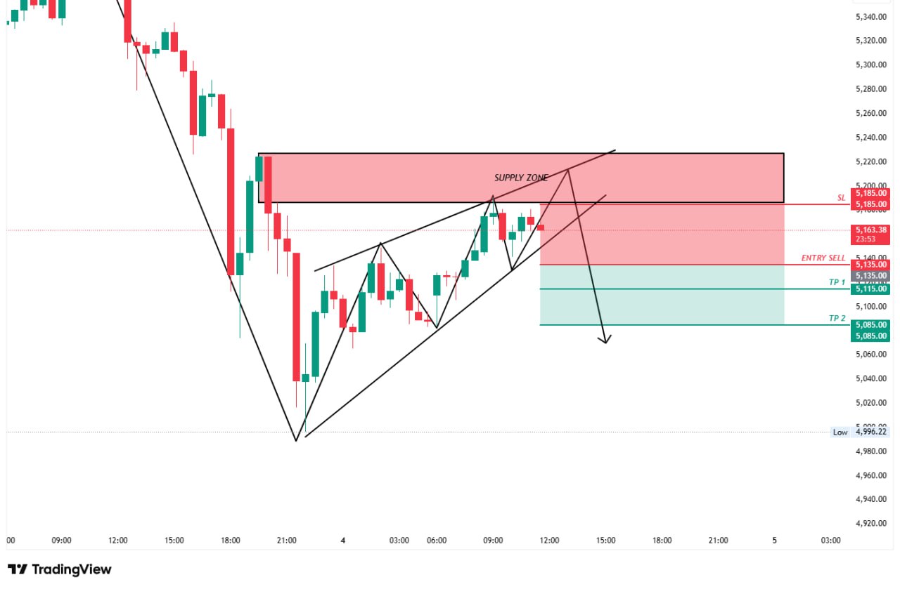 Level 5153 β 5180 merupakan Supply Zone krusial yang juga bertepatan dengan garis resistansi atas pola pennant, sehingga dapat membatasi kenaikan harga. Apabila terbentuk konfirmasi swing high di area tersebut, harga berpotensi turun lebih dalam menuju target 5135.00 hingga 5110.00 dengan peluang posisi jual menggunakan rasio risiko terhadap keuntungan 1:1.