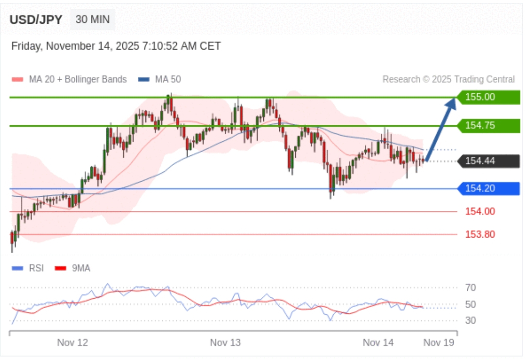 - Support: MA 50 di 154.20, diikuti oleh 154.00, dan 153.80.