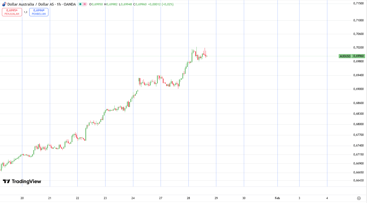 Struktur Tren: Grafik menunjukkan pola ascending channel (saluran naik) yang konsisten sejak pertengahan Januari. Harga saat ini berada di kisaran 0,6996, mendekati level tertinggi sejak Februari 2023.