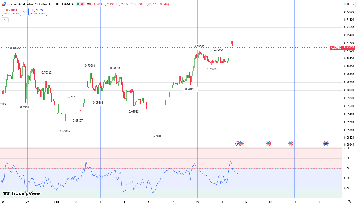 Breakout Multi-Year High: Harga baru saja menembus level psikologis 0.7100, yang merupakan level tertinggi sejak Februari 2023. Penembusan ini menandakan dominasi pembeli (bullish) yang sangat masif.