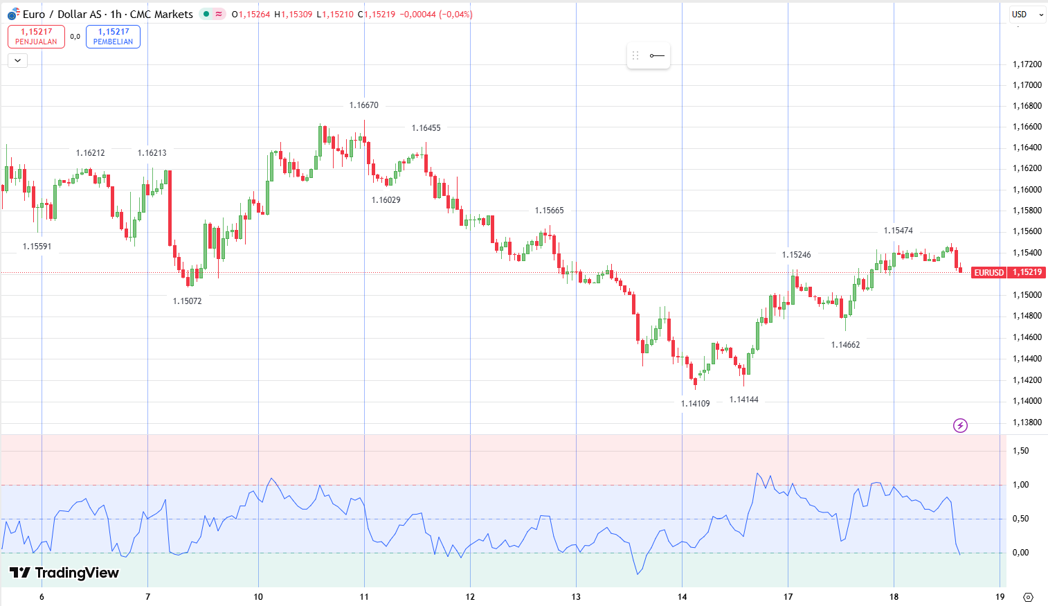 Konfirmasi Rejeksi: Terlihat adanya penolakan harga (rejection) pada candle terakhir di sekitar level 1.15219. Harga gagal menembus area 1.1550 dan mulai menunjukkan tanda-tanda pelemahan jangka pendek.
