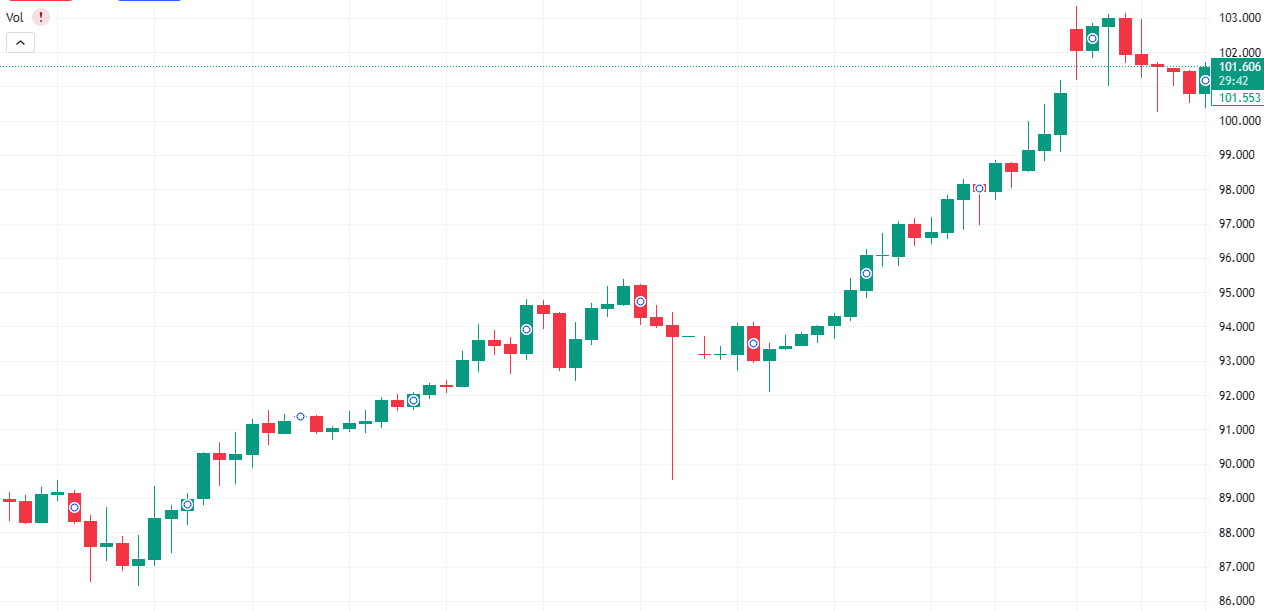 Struktur Harga: Munculnya higher high yang berurutan menunjukkan bahwa setiap koreksi kecil (seperti yang terlihat di area 94.00-95.00) langsung diserap oleh pembeli untuk mendorong harga lebih tinggi lagi.