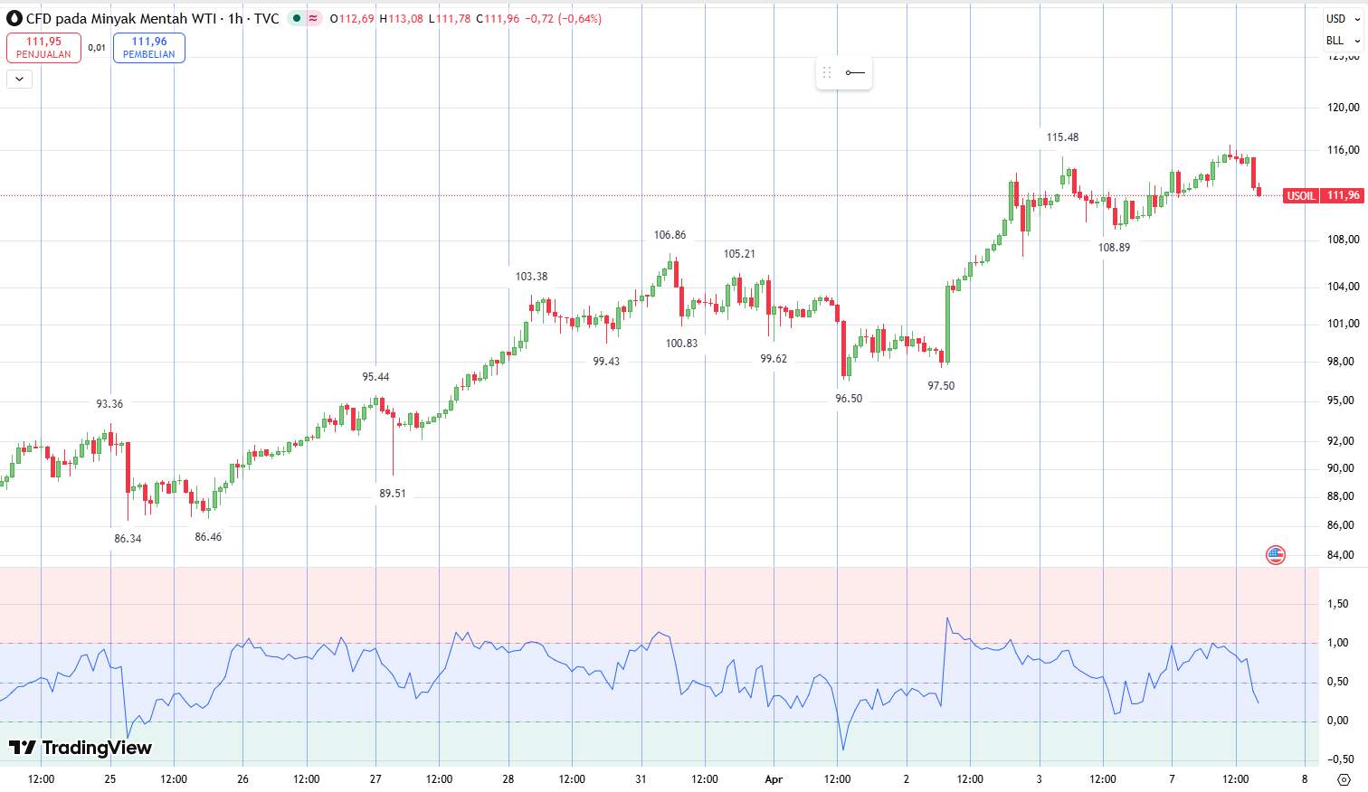 Resistance Terdekat: $113,28 (puncak sebelumnya) dan $115,48.