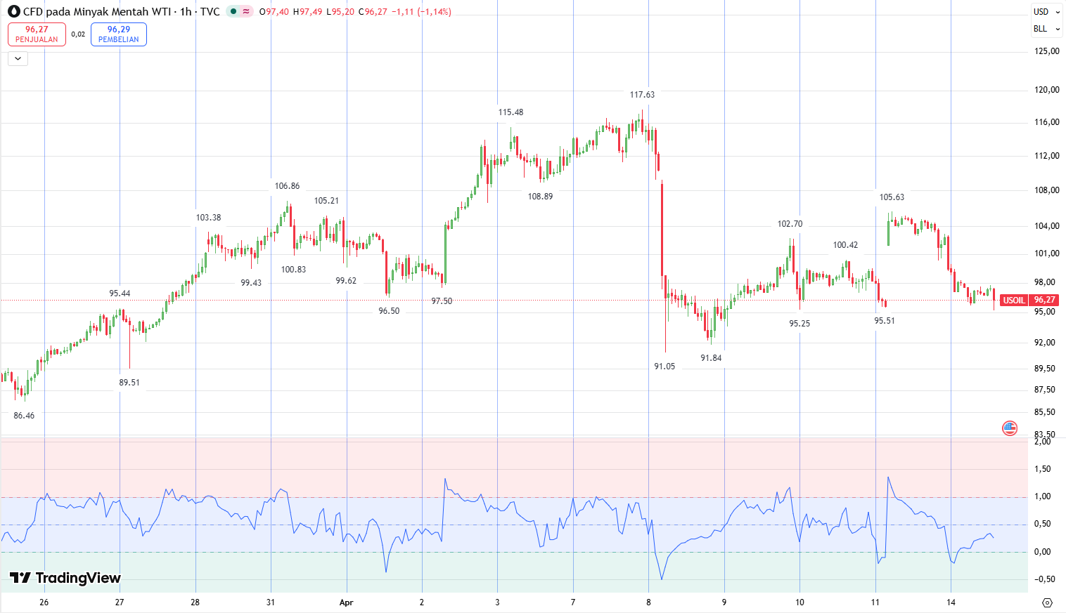 Support & Resistance: * Resistance: Titik terdekat ada di $98,15 (High 13 April) dan hambatan psikologis di $100,42.