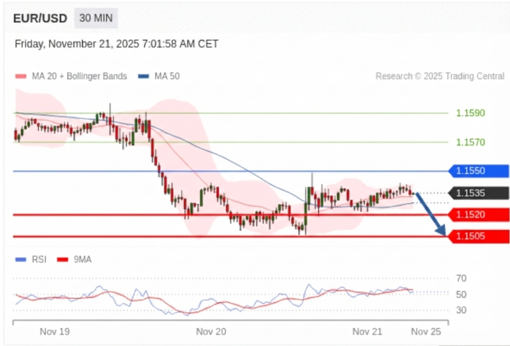 Ekspektasi Pemangkasan Bunga The Fed: Kenaikan tingkat pengangguran tersebut justru meningkatkan spekulasi pasar bahwa The Fed mungkin akan memangkas suku bunga di bulan Desember. Probabilitas pemangkasan bunga naik menjadi 36% (dari sebelumnya 30%). Meningkatnya peluang pemangkasan bunga ini menjadi beban bagi Dolar AS, sehingga memberikan ruang bagi Euro untuk naik.