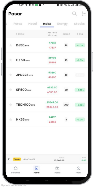 - Silakan klik menu ‘Pasar’ untuk mulai coba demo trading.