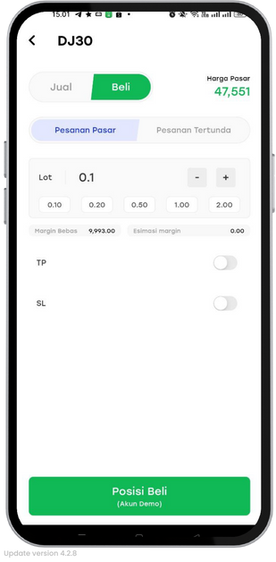 - Jangan lupa atur juga TP dan SL untuk membatasi risiko kerugian. Klik tombol ‘Posisi Beli’ untuk mulai mengeksekusi trading.