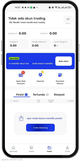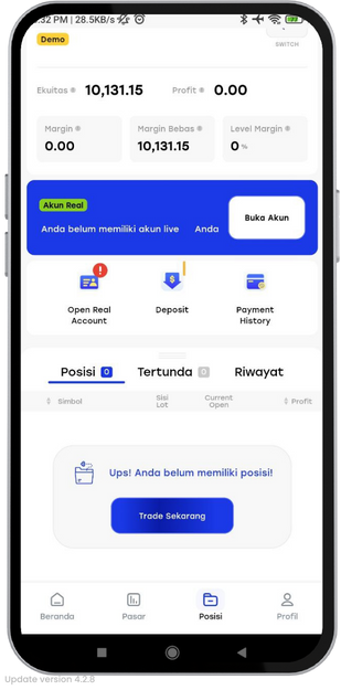 - Saat masuk ke menu ‘Posisi’, klik ‘Switch’ dan akun demo akan muncul.